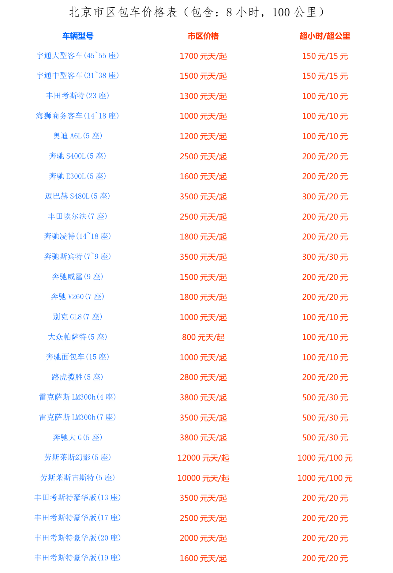 車型:豐田埃爾法、奔馳轎車、奔馳商務V260、別克商務ES、奧迪A6L、邁騰、帕薩特、豐田凱美瑞、豐田考斯特、中型客車、大型客車。